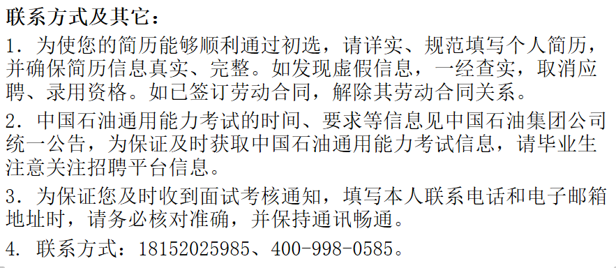 2.中国石油通用能力考试的时间、要求等信息见中国石油集团公司统一公告,为保证及时获取中国石油通用能力考试信息,请毕业生注意关注招聘平台信息。