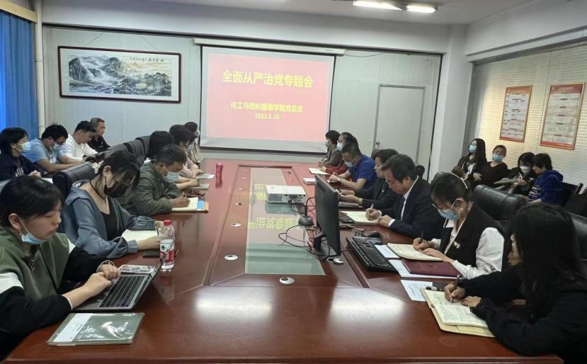 为进一步落实全面从严治党要求,充分发挥全面从严治党引领保障作用。5月16日下午,化纺服学院党总支在崇文楼811会议室召开全面从严治党专题会议,学院总支书记贾格维、院长王化冰、副院长刘迪以及全体党员参加会议。会议由党总支书记贾格维主持。