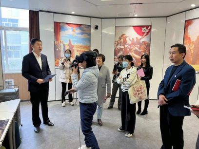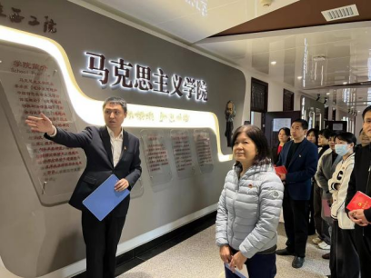 揭牌仪式之后,在马克思主义学院实训中心主任陈杜昊的带领下,双方一同参观了马院思政实训基地“学马研习·践创空间”,切身感受了5G教学模式、VR与3D红色资源,并讲述了一堂生动的二十大精神微党课。随后,在校史馆前合影留念。